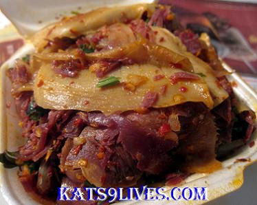 So in Islamic cuisine they do not serve pork and they are known for their big Sesame & Green Onions Pancake. My parents like the thin type because it is suppose to be crispy on the outside, yet maintain a chewy texture on the inside. You use this instead of rice with the meal to tone down the strong flavors of the dish. My Dad did not like the pancake here anymore. It didn't have the same texture and "oomph" as it used to. I thought it was a bit bland and only had hints of salt flavor and nothing else.